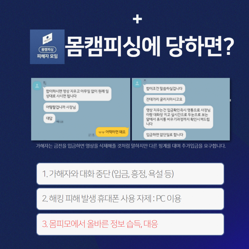 정말 안타깝게도, 금전만으로 문제를 해결하려다 보면 사기범이 오히려 시간을 벌어 영상을 일부 지인에게 시범 전송해 압박 수위를 높일 수도 있으니 주의하세요.